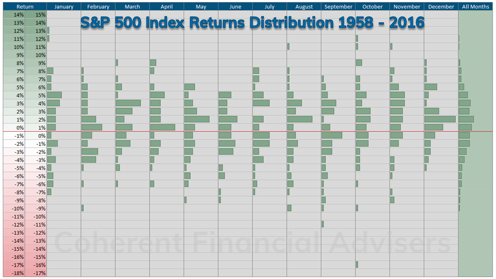 Coherent’s independent study4 is summarized in figure-3 and figure-4. During the 59-years3 from 1958 through 2016, September has been the worst performing month of the year for stocks. October is distinguished by its high variability or volatility of returns, which diminishes its otherwise positive average performance.