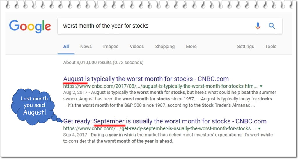 As part of my research for this article, I googled “worst month of the year for stocks”. Page-1 yielded these two consecutive results in figure-1. Note that they are posted one month apart by the same source. I guess it depends on their definition of usually and typically. I can’t wait to see which adverb will be featured in their October article. Perhaps facetiously!