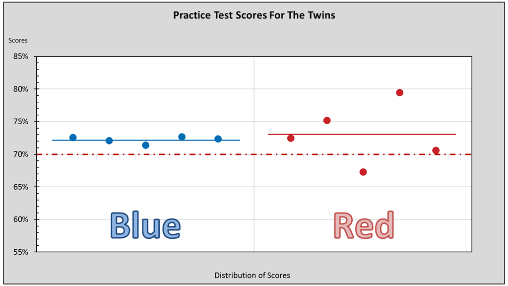 Mr. Beard’s twins, Blue and Red, are studying for final exams. To assess their readiness, Mr. Beard gives each twin five practice exams. Blue averages 72.2% and Red 73.0%. The passing score is 70%.