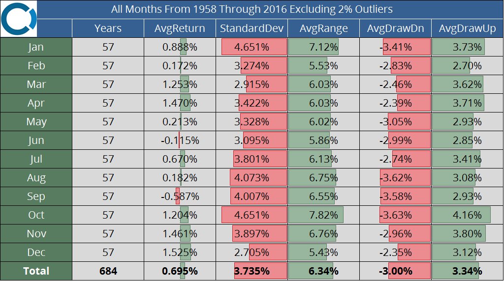 We will define “certainty” as being 95% confident that a month’s average return is truly above or below 0.7%. This requires that we incorporate each month’s performance variability after properly addressing outliers.